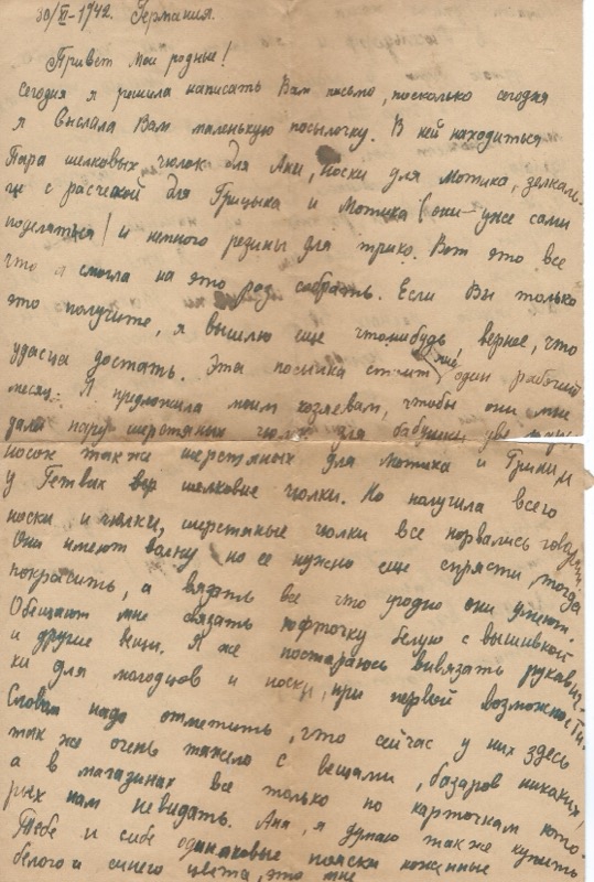 One of the earliest letters. Despite being a forced laborer, Raisa managed to gather gifts for her family: silk stockings for her sister Anya, socks for Motik, a little mirror and comb for the boys. She notes that even in Germany, things are hard to get — everything requires ration cards, “which they don’t give us.”