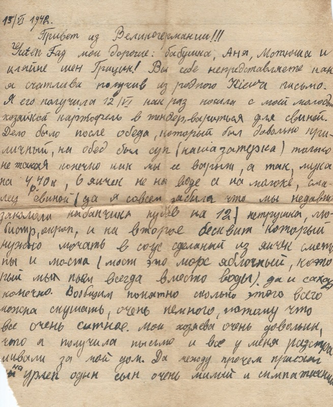 15/VI 1942. Привет из Великогермании!!! Читен Гад мои дорогие: бабушка, Аня, Мамочка и клятие мен Грицик! Вы себе непредставляете как я счастлива получив из родного Киева письмо. Я его получила 12/VI как раз посила с моей молодой хозяйкой картофель в тиндер, вариться для свиней. Дело было после обеда, который был довольно приличный, на обед был суп (каша затёрка) только не такая конечно как мы её варим, а так, мука на 4 чок, 6 яичек не на воде а на молоке, смалец свиной (да я совсем забыла что мы недавно закололи кабанчика пудов на 12) петрушка, любисток, окроп, и на второе бисквит который нужно мочать в соус сделанный из яичн сметаны и молока (мост это морс яблочный, который мы пьем всегда вместо воды) да и сахар конечно. Вообщим понятно сколько этого всего можна скушать, очень немного, потому что все очень сытное. Мои хозяева очень довольни, что я получила письмо и все у меня расспрашивали за мой дом.