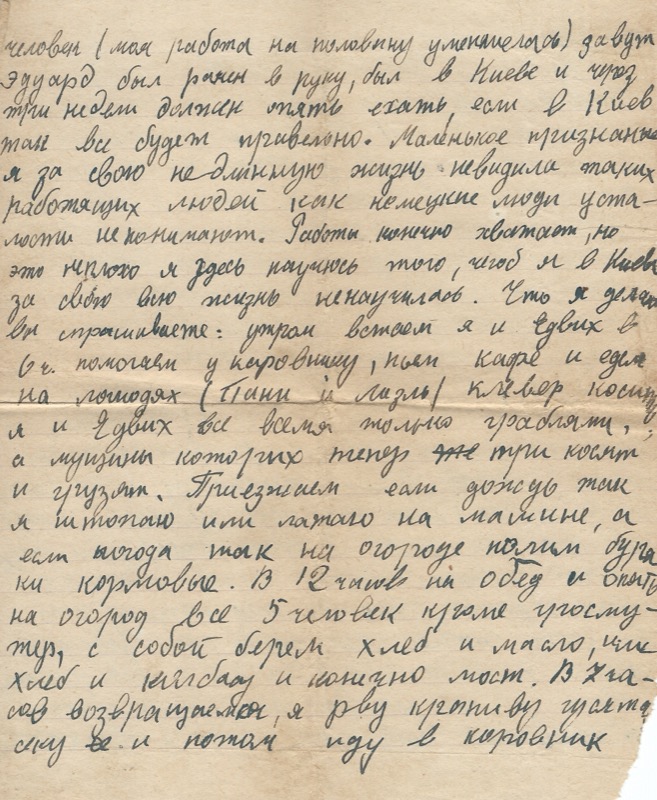 …человек (моя работа на половину уменьшилась) зовут Эдуард был ранен в руку, был в Киеве и через три недели должен опять ехать, если в Киев там всё будет привезено. Маленькое признание: я за свою не длинную жизнь невидила таких работающих людей как немецкие люди усталости не понимают. Работы конечно хватает, но это ничего я здесь научусь того, чего я в Киеве за свою всю жизнь ненаучилась. Что я делаю вы спрашиваете: утром встаю я и едых в 6ч. помогаю у коровнику, пью кафе и еду на лошадях (Пани и лади) клевер косить и в едых все время только граблят, а мужчины которых теперь три косят и грузят. Приезжаем еат домой так я штопаю или латаю на машине, а если погода так на огороде полим бурáки кормовые. В 12 часов на обед и опять на огород все 5 человек после угосмотр, с собой берем хлеб и масло, чи хлеб и […] и конечно мост. В 2 часов возвращаемся, я рву крапиву […] и потом иду в коровник…