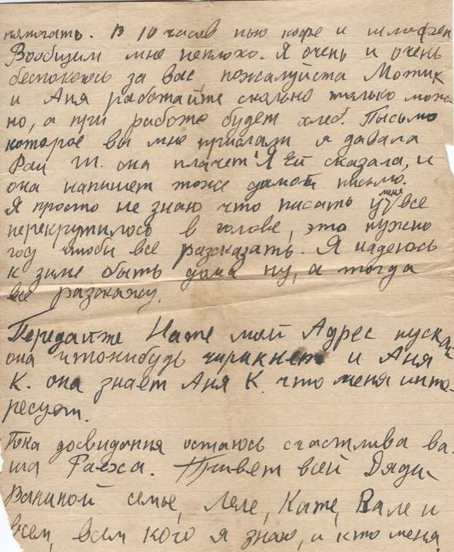 …помогать. В 10 часов пью кофе и шлифен. Вообщим мне неплохо. Я очень и очень беспокоюсь за вас пожалуйста Мотик и Аня работайте сильно только можно, но, а при работе будет хлеб. Письмо которое вы мне прислали я давала Рай М. она плачет. Я ей сказала, и она напишет тоже самоё письмо. Я просто не знаю что писать у меня всё перекрутилось в голове, это нужно год чтобы всё рассказать. Я надеюсь к зиме быть дома ну, а тогда всё расскажу.