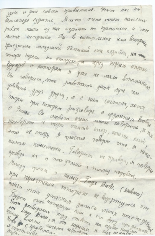 …здесь и уже совсем привыкши. Учат нас на велосипеде ездить. Также очень много польских ребят много из них играют на гармошке и мы как не скучаем. Он говорит, что работать дома лучше чем убивать друг друга, и с ним согласна, хотя спорю при каждом разговоре о фронте и вообще о России. Между прочем я пишу Тагебух (дневник) при перечтении которого не удержусь от плача это ужасная запись моих похождений. Будет очень интересно если я его буду при[везу домой…]