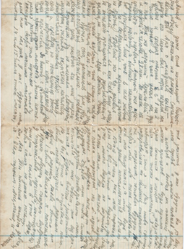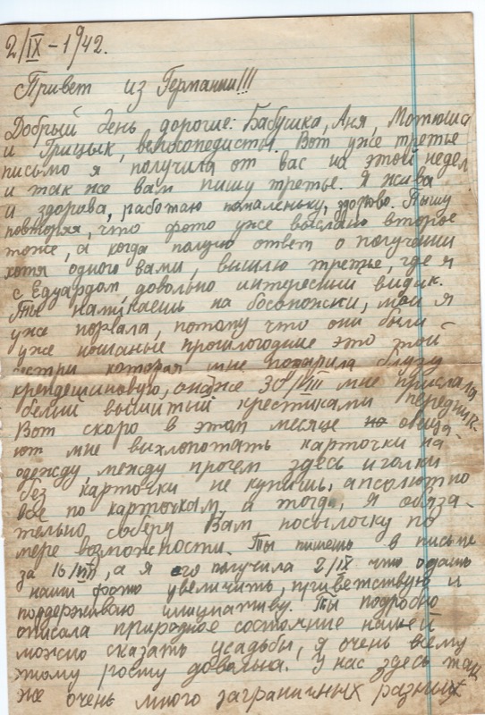 2/IX - 1942. Привет из Германии!!! Добрый день дорогие: Бабушка, Аня, Мотюша и Гришук, велосипедисты. Вот уже третье письмо я получила от вас на этой неделе и так же вам пишу третье. Я жива и здорова, работаю помаленьку, здорово. Пишу повторяя, что фото уже высылаю второе тоже, а когда получу ответ о получении хотя одного вами, вышлю третье, где я с Эдуардом довольно интересный видик. Ты намекаешь на босоножки, так я уже порвала, потому что они были с уже кошаные прошлогодние… которая мне подарила блузку крепдешиновую, ещё 30/VIII мне прислали белый вышитый крестиками передник. Вот скоро в этом месяце мне около от мне выхлопотать карточки на одежду между прочем здесь иголки без карточки не купишь, абсолютно всё по карточкам, а тогда, я обязательно соберу вам посылочку по мере возможности. Ты пишешь в письме за 16/VIII, а я его получила 2/IX что отдаете наши фото увеличить, приветствую и поддерживаю.
