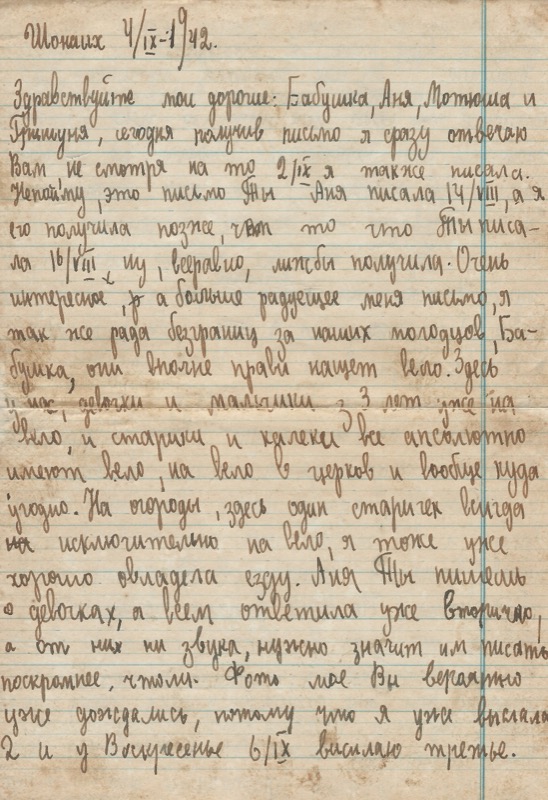 Здравствуйте мои дорогие: Бабушка, Аня, Мотроша и Гринуня, сегодня разувш письмо я сразу отвечаю Вам не смотря на то 2/IX я также написала. Очень интересное, и а больше радующее меня письмо, я так все рада безгранично за наших молодцов.