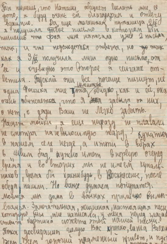 Пишет тойки, а еще ни разу не плакали не смотря на невыносимую жару, купаться в нашем селе негде, а итти в [неразборчиво] нет в первую очередь время и во вторих мы не имеем купальников, время бы как-нибудь, в Воскресенье, после обеда, нашли. Но всяке думает покупатся. Моемся мы дома в ваннах, гулично вымываемся.