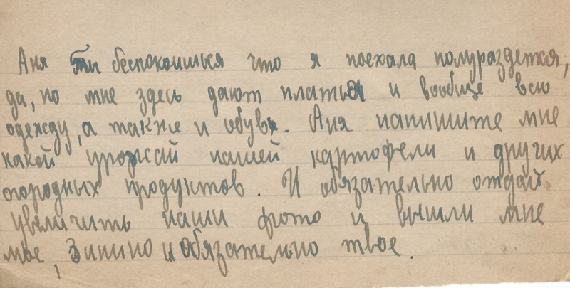 Аня ты беспокоишься что я поехала полураздетая, да, но мне здесь дают платья и вообще всю одежду, а также и обувь. Аня напишите мне какой урожай нашей картофели и других огородных продуктов. И обязательно отдай увеличить наши фото и вышли мне, Занино и обязательно твое.