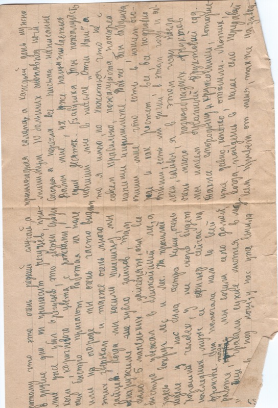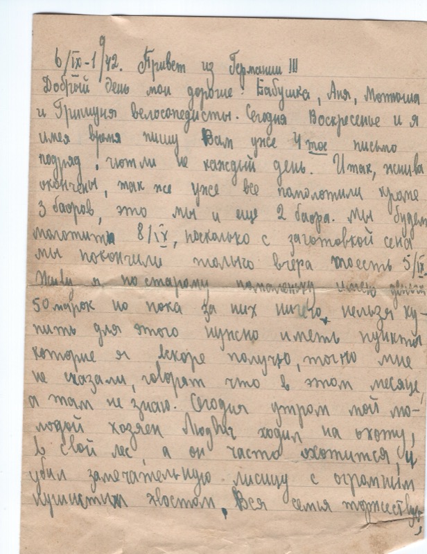 6/IX-1942. Привет из Германии!!! Добрый день мои дорогие! Бабушка, Аня, Мотюша и Гришуня велосипедисты. Сегодня Воскресенье и я имею время пишу Вам уже 4-тое письмо подряд, почти не каждый день. Итак, жнива окончены, так нас уже все наполнили кроме 3 амбаров. Мы будем молотить 8/IX, поскольку с заготовкой сена мы покончили только вчера то есть 5/IX. Я, по старому имею денег 50 марок но пока за них ничего нельзя купить для этого нужно иметь пункты которые я вскоре получу. Сегодня утром мой молодой хозяин Людвиг ходил на охоту, в свой лес, а он часто охотится и убил замечательную лисицу с огромным пушистым хвостом. Вся семья торжествует.