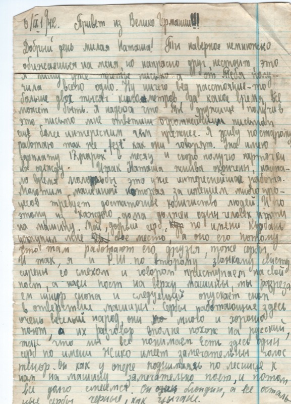 6/IX 1942. Привет из Великой Германии!!! Добрый день милая Наташа! Вы наверное немножечко обижаешься на меня, но напрасно друг, несмотри что я пишу уже третье письмо и от Тебя получила всего одно. Ну ничего ведь расстояние-то большое двух тысяч километров да какое время, всё может быть. Я надеюсь что Вы дружище получив это письмо мне ответим обстоятельным письмецом ещё более интересным чем прежнее. Я живу по старому работаю так же “fest” как они говорят. Уже имею зарплату 17 марок в месяц и скоро получу карточки на одежду.