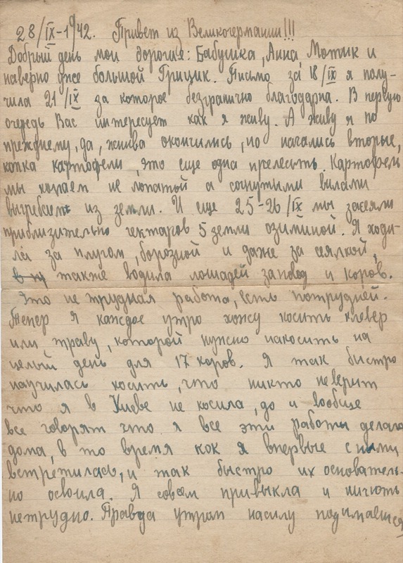 Добрый день мои дорогие: Бабушка, Алиса, Мотик и наверно уже большой Гришик. Письмо за 18/IX я получила 21/IX за которое безгранично благодарна. В первую очередь Вас интересует как я живу. А живу я по прежнему, да, жнива окончились, но начались вторые, копка картофеля, это еще одна прелесть. Картофель мы копаем не лопатой а согнутыми вилами выгребаем из земли. И еще 25-26/IX мы засеяли приблизительно гектаров 5 земли озиминой. Я ходила за плугом, бороной и даже за сялкой, в те также водила лошадей завод и коров.