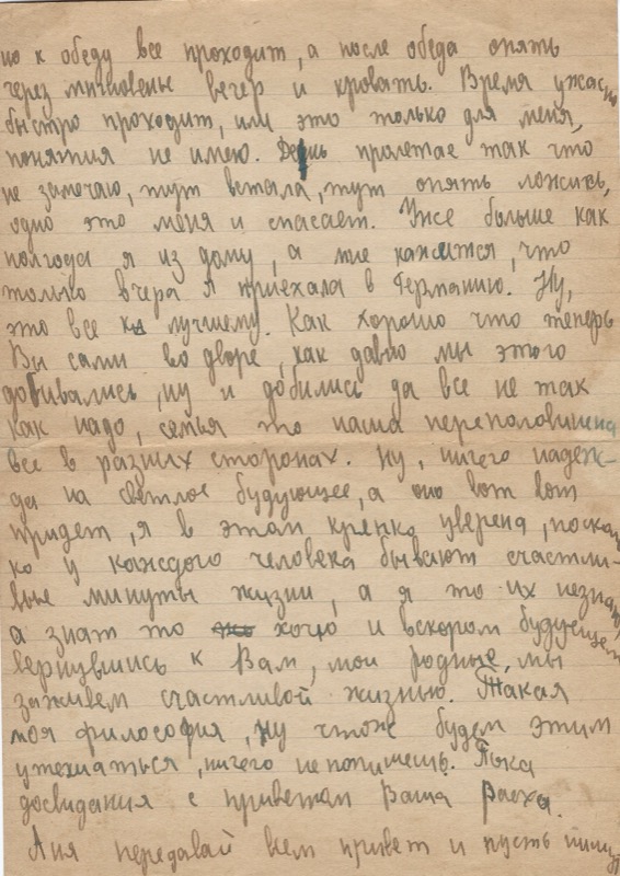 Как хорошо что теперь Вы сами во дворе, как давно мы этого добивались ну и добились да все не так как надо, семья то наша переполовинена все в разных сторонах. Ну, ничего — надежда на светлое будущее, а оно вот вот придет, я в этом крепко уверена. Пока у каждого человека бывают счастливые минуты жизни, а я то их незнаю, а знаю то что когда и вскором будущем вернувшись к Вам, мои родные, мы заживем счастливой жизнью. И такая моя философия, ну чтож будем этим утешаться, ничего не поможешь.