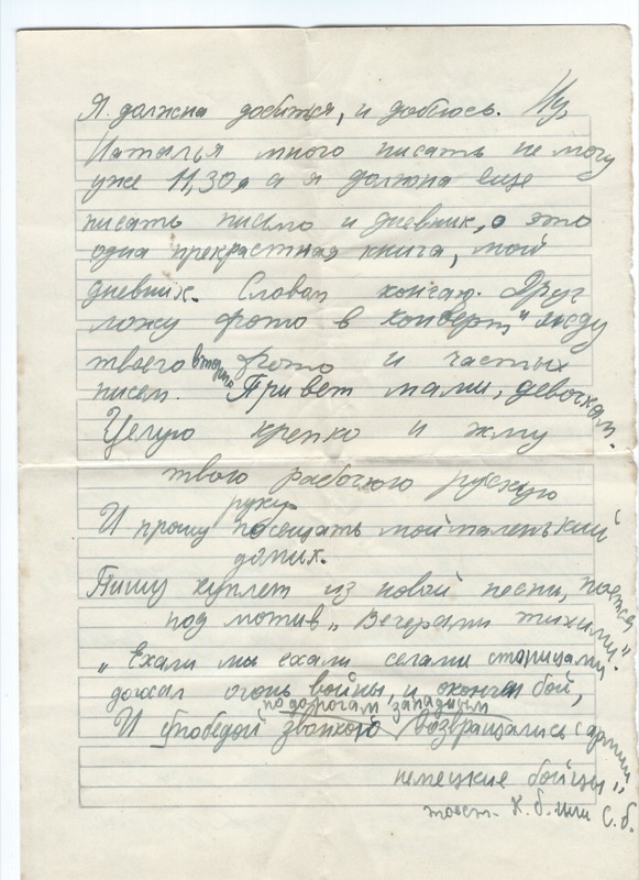 Я должна добиться, и добьюсь. Ну Наталья много писать не могу уже 11.30 а я должна еще писать письмо и дневник. Целую крепко и жму твою рабочую русскую руку.