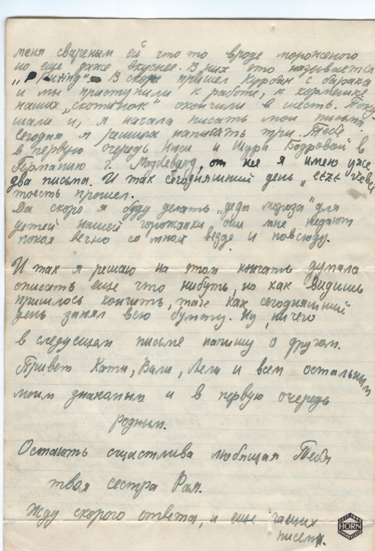 …меня сваренным ей что-то вроде мороженого но еще даже вкуснее. У них это называется “Pudding”. Вскоре пришел Курбан с барака и мы приступили к работе, к кормлению наших “скотинок” окончили в шесть. Покушали и, я начала писать мои письма сегодня я решила написать три. Тебе в первую очередь Нюси и Шури Бодровой в Германию г. Magdeburg, от нее я имею уже два письма. И так сегодняшний день “jetzt” то есть прошел.