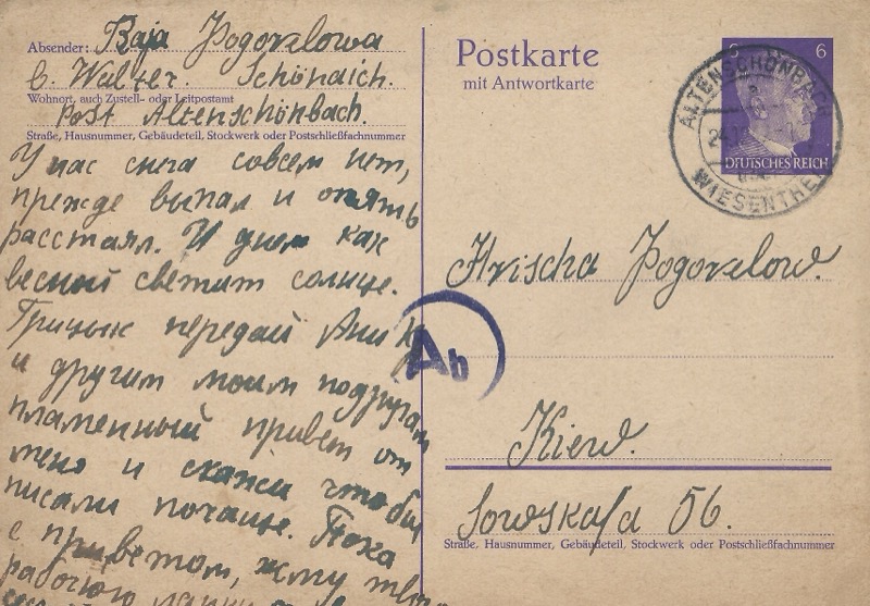 A postcard sent to Arischa Pogorelowa (a different family member — possibly Iryna?) describing an unusually mild winter in Franconia: snow fell but melted, and the sun shines like spring. The recurring phrase “working hands” and “flaming greetings” are Raisa’s signature sign-offs, reflecting both Soviet-era rhetoric and genuine warmth.