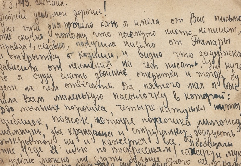 7.5.1943. Добрый день, мои дорогие! Уже три дня прошло как я имела от Вас письмо, мне скучно, потому что почему-то никто не пишет, правда, недавно, получила письмо от Тамары и открытку от Кодиции, и вижу что […] зависит от наличия на чём писать. Уж нич[его] но я буду слать двойные открытки и тогда будет на чём отвечать. Да пятого мая я выслала Вам маленькую посылочку в которой: два пыльных порошка, четыре катушки ниток, гребешок, поясок, четыре порошка [лимонной?] […], два карандаша и стирачку, двадцать открыток, ну и кажется всё. Подбежали мне [где я шью по воскресениям] сахару и муки я узнаю можно ли слать больше одного килограмма.