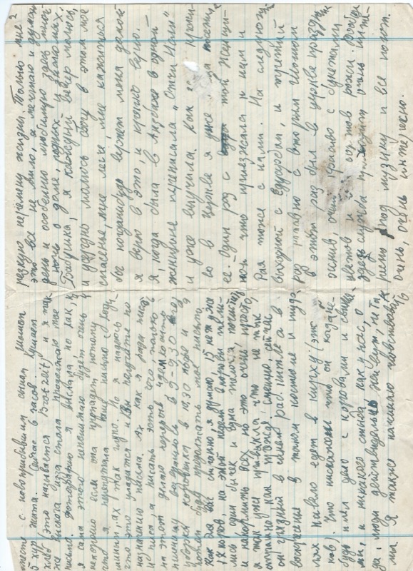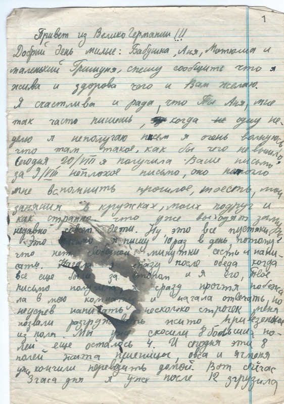 …Сейчас Тетвиг с Мамой упаковывают посылку Эдуарду, который выехал 10/VII в г. Франкфурт и через 8 дней выезжает на фронт. Жалко что он так мало всего в этот раз 4 дня побыл дома, а он очень хороший человек. Стот тоже очень добрый, а именно культурный, и конечно достаточно внимателен ко мне так как и Эд. Я грушка, слива, яблочко “всё только моей Рай” говорит он. Вот и сейчас он сидит рядом со мной и говорит, что жалко, что он не может по русски читать и писать, и просит чтобы я перевела что пишу. Твоё письмо я почти всё переводила, говорят что очень умное интересное.