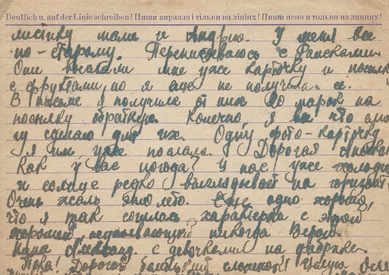 …листку маме и Андрію. І мені все по-старому. Переписываюсь с Раисками. Они писали мне уже карточку и посылку с фруктами, но я ещё не получала её. В июле я получила от них 10 марок на посылку обратно. Конечно, я на это ещё и сделаю для них одну фото-карточку я им уже послала. Дорогая мамо[неразборчиво] Как у вас погода? У нас уже холодно и солнце редко [неразборчиво] на природу. Очень жаль это лето. Ещё одно [неразборчиво], что я так сошлась характером с одной хорошей, [неразборчиво] никогда Верой. Мира [неразборчиво] с девочками на фабрике. Пока! Дорогой бабушки моющей!