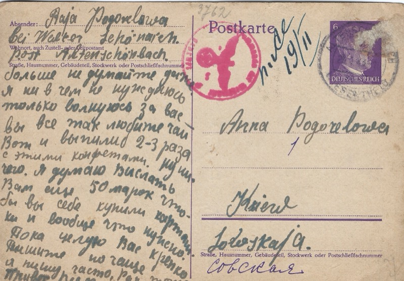 Another 50 marks sent home — Raisa repeatedly sends money despite earning only 17 marks/month in wages. She likely saves from her sewing side work. She sent candies for tea, knowing her family loves it. The family has moved to a new address: Łoboskaja 4 (previously Sowskaja 56). Her selflessness is total: “I need nothing, I only worry about you.”